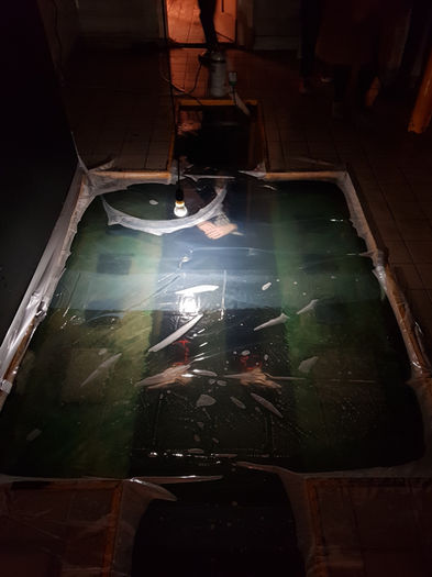 Bodies of Water is a site-specific performance happened in a old car repairing garage. At the centre of the room two cross-like holes, where technicians used to lie down, become the place of embalming or temporarily preserving a human body. The image is the one of controversy, even tough the body seems dead it slowly moves under a plastic coat and breathe from a transparent hose. Entering the space the viewer has the feeling of being inside of a scientist room, where life experiments are taking place. Questioning its position as human being the viewer is brought into a journey towards its root. Bodies of Water reminds us of a foetus inside the womb or a cadaver inside its coffin. Precisely, water represents such dual and counterposed effect; one of giving life and pleasure; one of giving agony and death.
